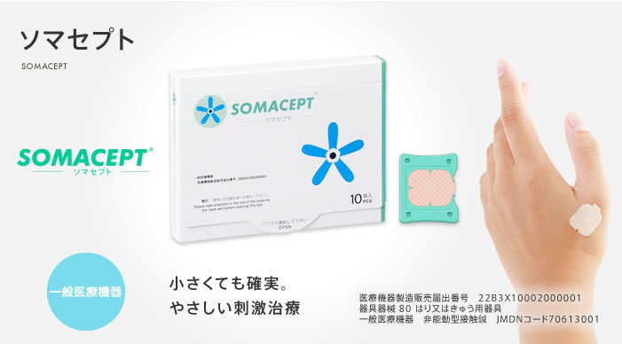 ソマセプトは、「貼るだけ簡単」「痛みを感じにくい」「医療現場でも使われる」一般医療機器です。